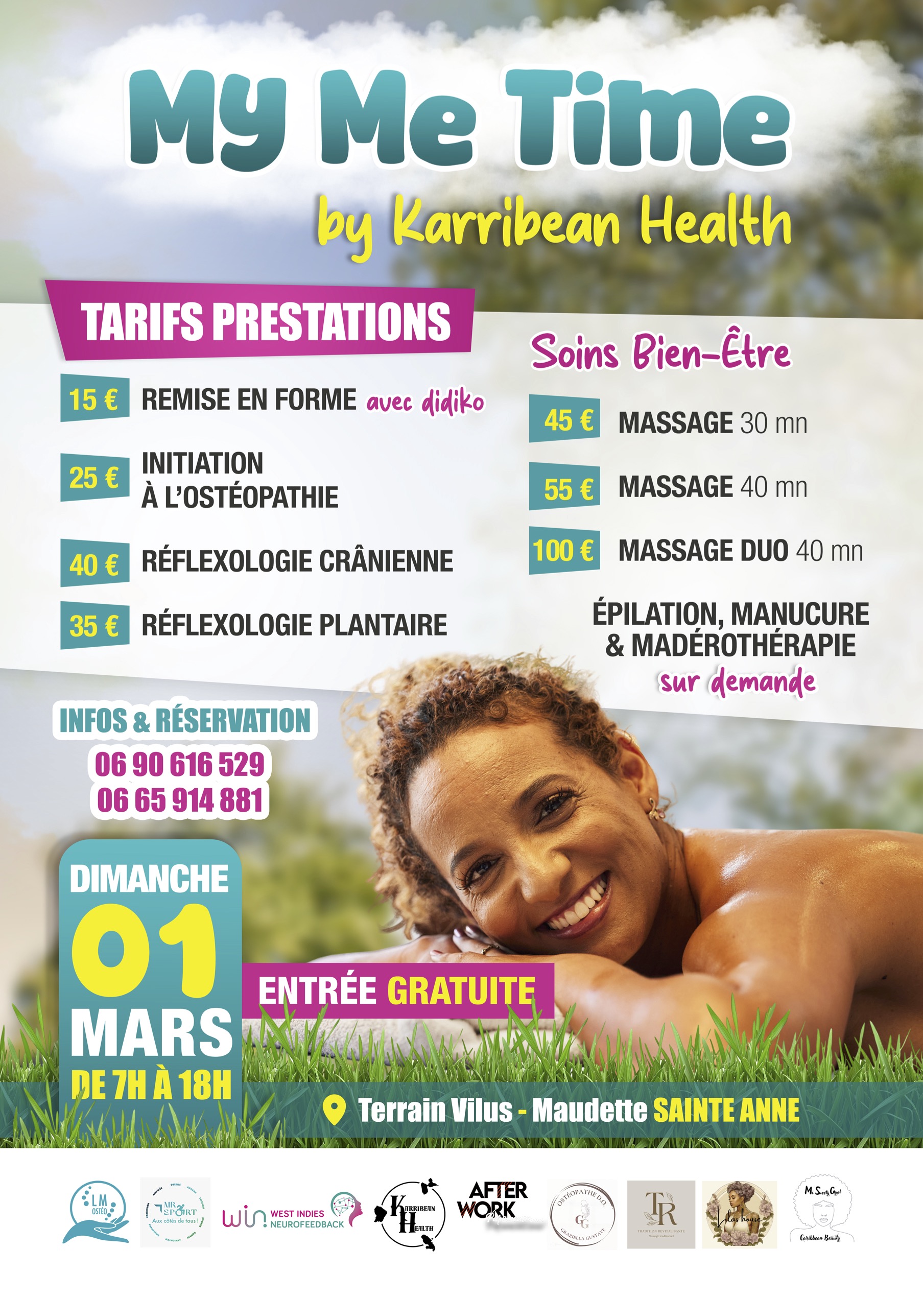 Votre Village santé « My me time » revient avec de nouveaux soins, activités et animations. Le dimanche 1er mars sera le jour où vous pourrez vous accorder un moment pour vous. Parles-en autour de toi dès maintenant. Venez en famille ou entre amis, ce jour est un moyen de s’évader l’espace d’une journée et de repartir avec des conseils pour sa santé physique et mentale.